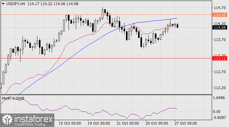 लेकिन, मूल्य वृद्धि के बावजूद, मार्लिन ऑसिलेटर दैनिक चार्ट पर बग़ल में आगे बढ़ रहा है, जो स्थिति को अनिश्चितता के एक निश्चित तनाव में रखता है। इस अनिश्चितता की सीमाएं निकटतम स्तरों द्वारा निर्धारित की जाती हैं: नीचे 113.12 - मूल्य चैनल की एम्बेडेड लाइन, शीर्ष पर - 114.48 - 15 अक्टूबर को उच्च। यदि कीमत इनमें से किसी एक से नीचे आती है, तो मध्यम अवधि कीमत की दिशा तय की जाएगी। मुख्य परिदृश्य 115.80-116.15 पर निकटतम लक्ष्य के साथ वर्तमान प्रवृत्ति की निरंतरता के रूप में युग्म की वृद्धि है।