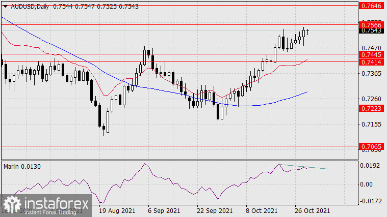 साथ ही, विचलन संशोधन का जोखिम होता है, ऐसे संस्करण को चार्ट पर डैश-डॉट लाइन के साथ चिह्नित किया जाता है, कीमत आज या कल 0.7566 के लक्ष्य स्तर तक पहुंच जाएगी, जहां से यह नीचे की ओर मुड़ सकती है। यह अनिश्चितता मजबूत मूलभूत परिस्थितियों द्वारा समर्थित है: रिजर्व बैंक ऑफ ऑस्ट्रेलिया आज की बैठक की रिलीज और सप्ताह की मुख्य घटना - फेडरल रिजर्व की बैठक - बुधवार को प्रकाशित करेगा।