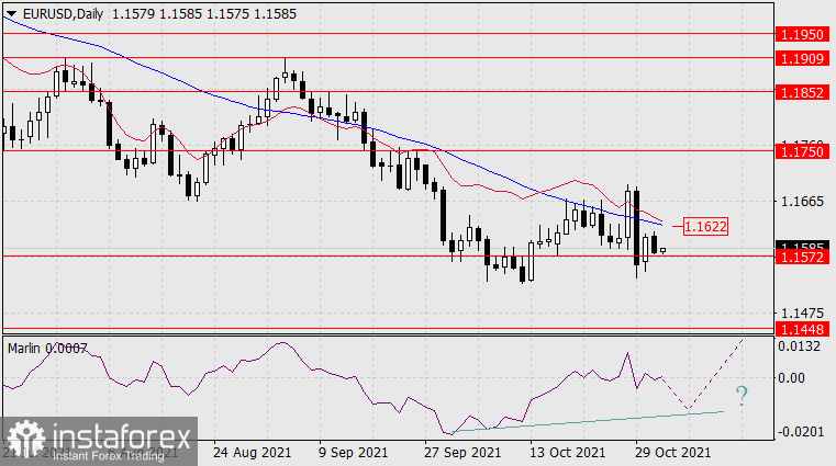 h4 चार्ट पर, लगता है कि मार्लिन ऑसिलेटर के साथ कीमत का अभिसरण अभी तक ट्रेंड रिवर्सल के लिए ताकत हासिल नहीं कर पाया है। शायद, एक दोहरा अभिसरण पक रहा है, जो ईसीबी रिलीज के प्रकाशन के समय बहुत जल्दी हो सकता है - 1.1572 के स्तर पर काम किया जाएगा, और फिर, हमारे मुख्य परिदृश्य के अनुसार, विकास विकसित होगा।