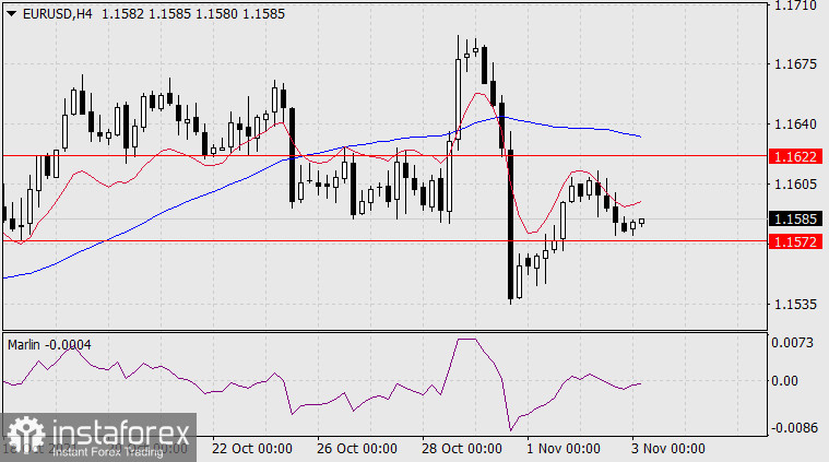 चार घंटे के चार्ट पर, मार्लिन ऑसिलेटर तेजी से ओवरबॉट ज़ोन से नीचे चला गया, कीमत 14 और 15 अक्टूबर को चोटियों के समर्थन के करीब पहुंच रही है, इस स्तर से ऊपर की ओर उलट होने की संभावना है या एक समेकन होगा ऊपर जाने के उद्देश्य से उस पर बना। बढ़ती प्रवृत्ति को गिरने वाले में बदलने के लिए, कीमत 1.1575 के स्तर से नीचे, एमएसीडी लाइन के नीचे होनी चाहिए।