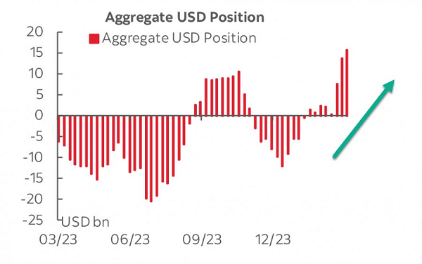 समीक्षाधीन सप्ताह के दौरान, शुद्ध लॉन्ग डॉलर की स्थिति अतिरिक्त $2.4 बिलियन बढ़कर $16.1 बिलियन हो गई, जो एक ठोस आशावादी स्थिति का संकेत है। अन्य मुद्राओं के मुकाबले कुछ छोटे बदलाव के साथ, डॉलर में मुख्य रूप से येन और यूरो के मुकाबले बढ़त हुई।