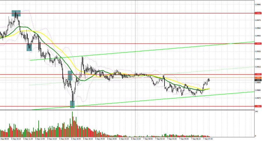 कल, व्यापारियों को बाजार में प्रवेश करने के लिए कई संकेत मिले, जिससे उन्हें लाभ हुआ। आइए 5 मिनट के चार्ट पर एक नजर डालते हैं कि बाजार में क्या हुआ। इससे पहले, मैंने आपको बाजार में कब प्रवेश करना है, यह तय करने के लिए 0.9984 के स्तर पर ध्यान देने के लिए कहा था। जर्मनी के काफी कमजोर आंकड़ों का यूरोपीय मुद्राओं पर अप्रत्यक्ष प्रभाव पड़ा। 0.9984 के झूठे ब्रेकआउट और इस स्तर से ऊपर जाने में खरीदारों की विफलता के कारण बिक्री का संकेत मिला, जिससे बड़े पैमाने पर बिकवाली हुई। परिणामस्वरूप, युग्म में 40 पिप्स की गिरावट आई। बुल्स ने बाजार पर नियंत्रण हासिल करने का प्रयास किया और 0.9941 के करीब खरीद संकेत बनाए। हालांकि, युग्म में केवल 15 पिप्स की वृद्धि हुई, फिर अमेरिका के मजबूत डेटा ने युग्म पर दबाव लौटाया। एक ब्रेकआउट और 0.9905 के ऊपर की ओर परीक्षण ने एक अतिरिक्त बिक्री संकेत दिया। परिणामस्वरूप, युग्म अन्य 40 पिप्स से गिरा। 0.9864 से रिबाउंड के बाद खरीदें ऑर्डर ने लाभ में अन्य 40 पिप्स दिए।
