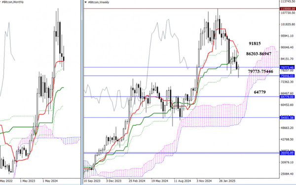 वर्तमान में, बाजार 79,773 – 75,446 के मासिक सपोर्ट स्तरों का परीक्षण कर रहा है। यदि मूल्य इस क्षेत्र के नीचे स्थिर हो जाता है, तो इससे बेअर्स को इन स्तरों पर नियंत्रण मिल जाएगा और इचिमोकू साप्ताहिक गोल्डन क्रॉस (78,416) अमान्य हो जाएगा, जिससे नई मंदी की संभावनाएं खुल सकती हैं। अगला सपोर्ट मासिक मध्यावधि ट्रेंड पर 64,779 के पास होगा।