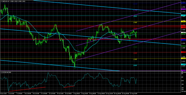 यूके में आर्थिक घटनाओं का कैलेंडर लगभग खाली है। कुछ आर्थिक रिपोर्टें तो हैं, लेकिन इनमें से कोई भी "महत्वपूर्ण" के रूप में चिन्हित नहीं है। कुल मिलाकर, मैं अन्य विश्लेषकों और अर्थशास्त्रियों से सहमत हूँ: अगस्त के अंतिम व्यावसायिक गतिविधि सूचकांक बाज़ार के लिए ज्यादा दिलचस्प नहीं होंगे। इनके अलावा, शायद केवल जुलाई के रिटेल बिक्री वॉल्यूम में बदलाव की रिपोर्ट, जो शुक्रवार को जारी होगी, अलग दिखाई देती है। हालांकि, शुक्रवार को बाज़ार का ध्यान अमेरिकी श्रम बाजार और बेरोज़गारी डेटा पर केंद्रित रहेगा।