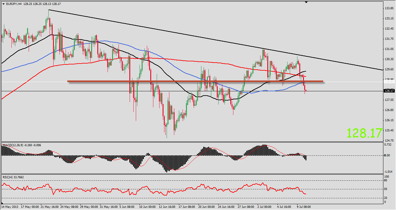 As you see in my following chart, the pair traded between a high of 130.53 and a low of 128.67, closed at 129.25. Today the pair trades below the resistance line of 128.80.