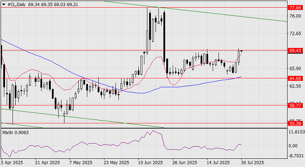 दैनिक चार्ट पर, मार्लिन ऑसिलेटर सकारात्मक क्षेत्र में प्रवेश कर गया है। और यह बिलकुल सही समय पर हुआ है, क्योंकि कीमत 69.43 के स्तर के आसपास उतार-चढ़ाव कर रही है। हालाँकि, कीमत संतुलन रेखा (लाल चलती औसत) से ऊपर उठ गई है, जो विकास के लिए एक प्रोत्साहन भी है।