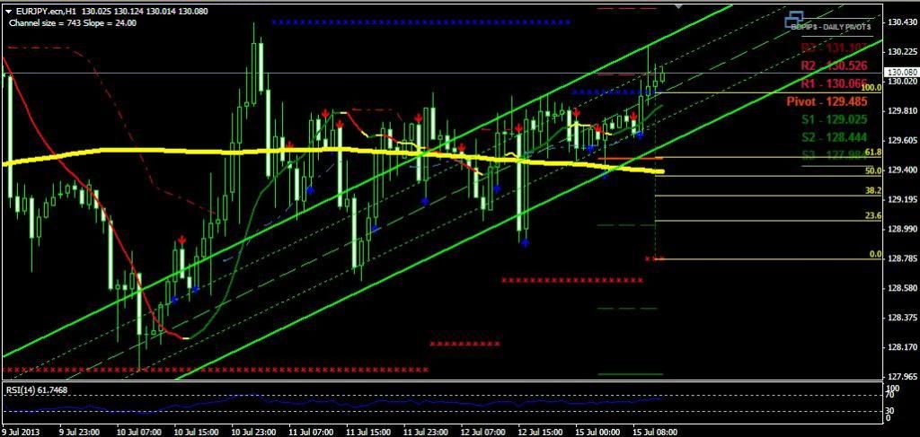 EUR/JPY pair is now up trend. The price already touched daily resistance 1 level (130.066). I think the price may touch daily resistance 2 level (130.526).