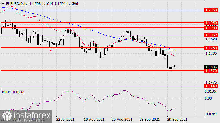 यूरो में सुधारात्मक गिरावट कल 1.1570 के लक्ष्य स्तर से नीचे जारी रही। ऐसा लगता है कि अब 1.1448 (मार्च 2019 के उच्च स्तर) के लक्ष्य स्तर का रास्ता खुला है, लेकिन यहां मार्लिन ऑसिलेटर के साथ अभिसरण सक्रिय है, जो कीमत को 1.1570 के स्तर से ऊपर ला सकता है और स्थिति को कम से कम एक तटस्थ अवस्था में वापस कर सकता है।
