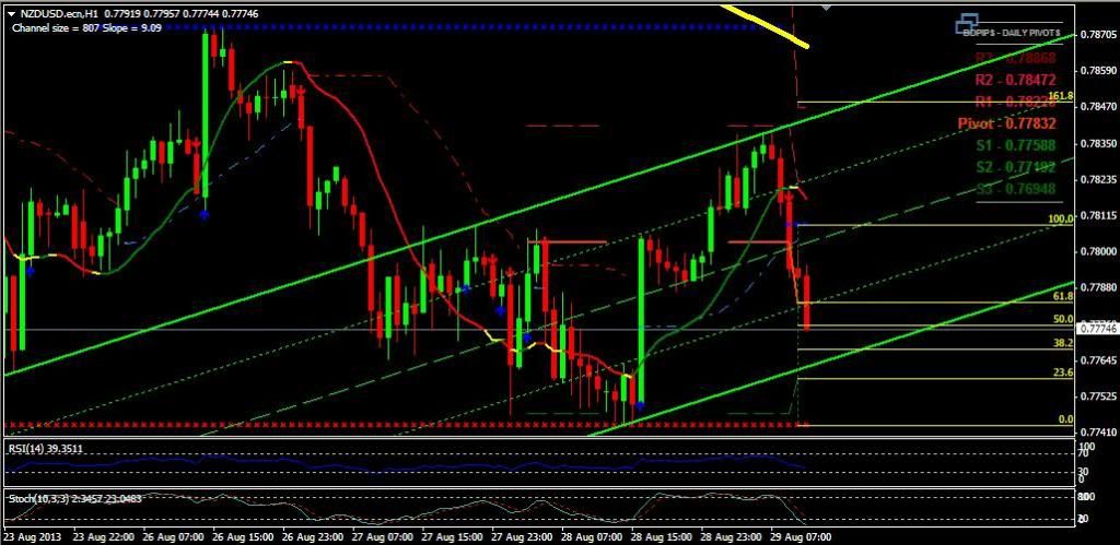NZD/USD pair is now down trend. The price already breakout daily pivot point (0.77832). I think the price may touch Fibo 38.2 level and lower trend line.