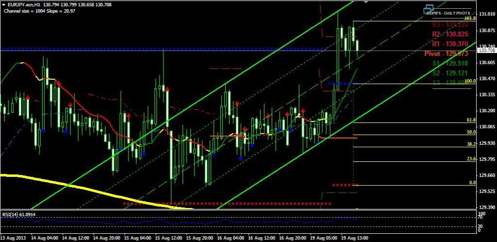 EUR/JPY pair price already touched daily resistance 2 level (130.825). Now the pair try to move down ward. I think the price may touch Fibo 100.0 level.