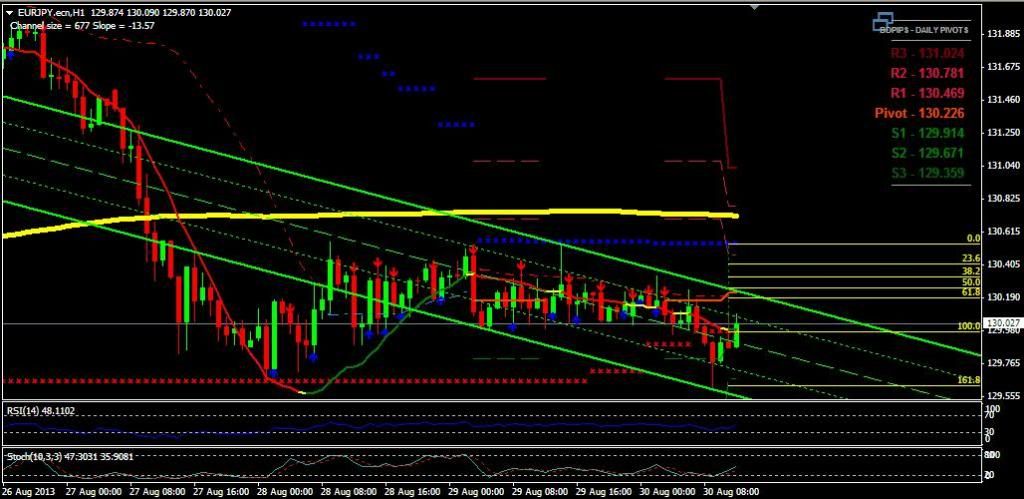 The following data is predicted based on indicators that we use for the currency pair EUR/JPY today, for today's support and resistance levels as follows: R3=131,04, R2=130,78, R1=130,5, Pivots=130,24, S1=129,96, S2=129,7, S3=129,42