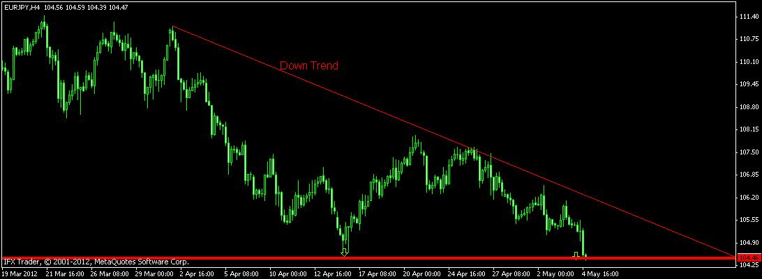 EURJPY is moving in down trend there as show in H4 chart , but there is a support level at 104.46 , so if the pair couldn't close below this level we will expect up direction for this pair till reach the down trend and make retest , and then we can make buy order .