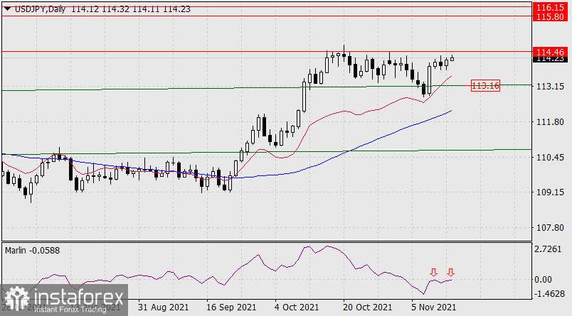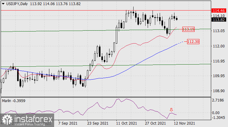 दैनिक चार्ट पर, मार्लिन ऑसिलेटर की सिग्नल लाइन अपनी शून्य रेखा से नीचे की ओर उलट जाती है। इसका मतलब है कि पिछले दो दिनों में मूल्य रैली 20 अक्टूबर से गिरावट से एक सुधार थी। यदि मूल्य 113.15 पर मूल्य चैनल के समर्थन से नीचे चला जाता है, तो यह मूल्य के और नीचे जाने के इरादे की पुष्टि करेगा। 112.30 पर मंदड़ियों का पहला लक्ष्य एमएसीडी लाइन है।
