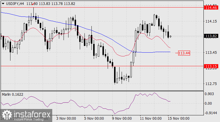 चार घंटे के चार्ट पर, कीमत गिर रही है, लेकिन संकेतक लाइनों से ऊपर है। एमएसीडी लाइन के तहत कीमत में गिरावट, 113.44 के स्तर से नीचे, नीचे की दिशा में मूल्य विकल्प का पहला गंभीर संकेत होगा।