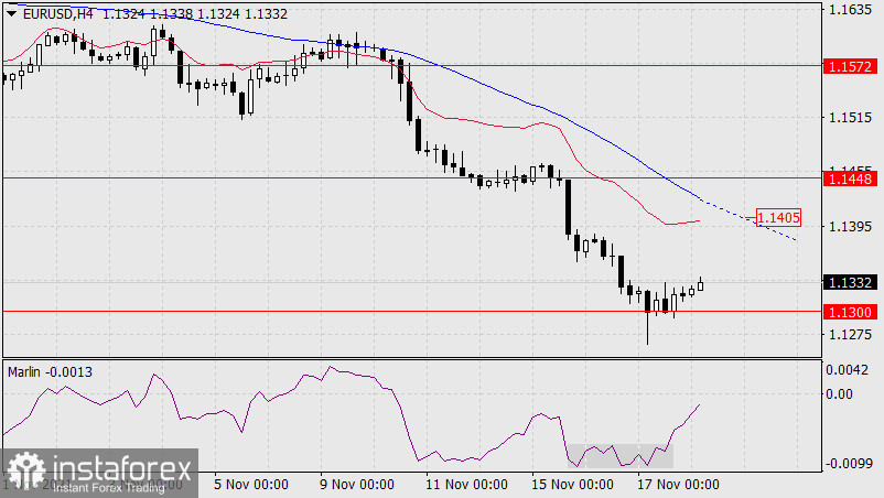 मार्लिन ऑसिलेटर ऊपर मुड़ रहा है, लेकिन कीमत के साथ अभिसरण करने में विफल होने के बाद, इसकी वृद्धि काफी अधिक होनी चाहिए ताकि इसे उलट के रूप में व्याख्या किया जा सके। 1.1300 पर चार घंटे के पैमाने पर, कैंडल्स को निकायों में व्यवस्थित किया जाता है, जो इस स्तर की शुद्धता का संकेत हो सकता है।
