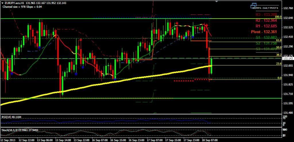 EUR/JPY pair price already breakout daily support 1 level (132.082). Now the price move to up ward. I think the price may touch Fibonacci 50.0 level.