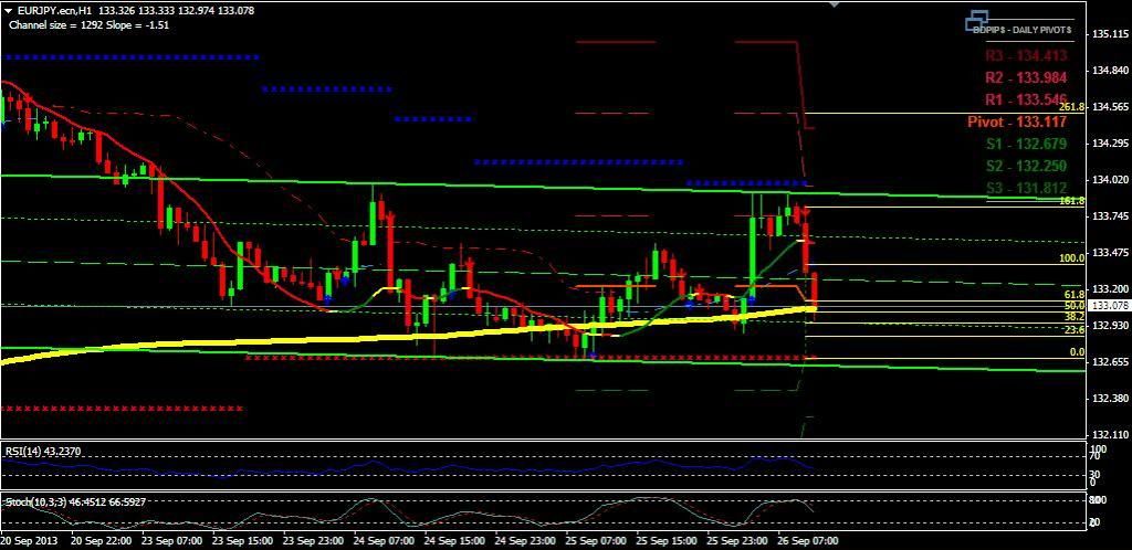 EUR/JPY pair is now down trend. The price already breakout daily pivot point (133.117). I think the price may touch daily support 1 level (132.679).
