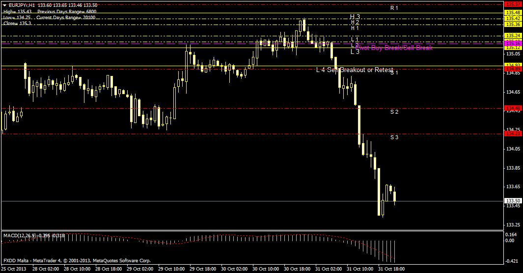 Today at date 2013/11/01 on the pairs EurJpy at market time on 01.32 I analyze from chart that's the time frame on M5, M15, M30, H1, H4, M1, and D1 outline leads to more bullish condition, and the Bollinger Bands indicator is also bullish and MACD indicator is indicated down trend signal and support resistance is showing below