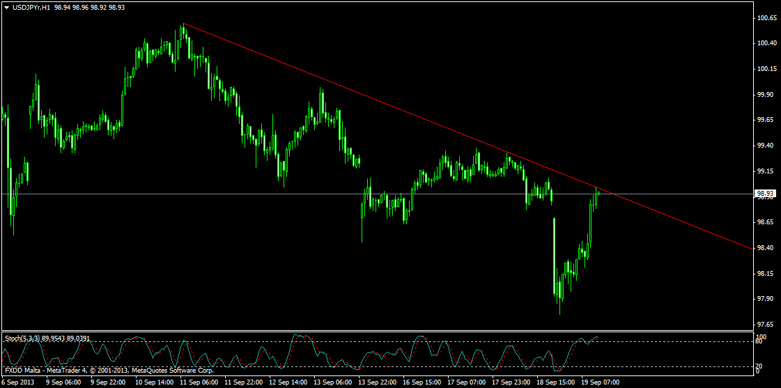 USD/JPY pair price already touched Fibonacci 23.6 level and upper trend line. Now the price try to move down ward. I think the price may touch daily pivot point (98.415).