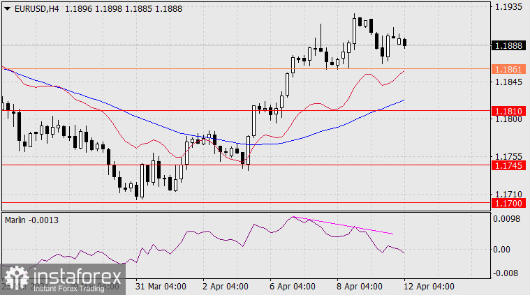 विचलन पूर्ण सीमा तक अपने प्रभाव को काम करता है- ऑसिलेटर की सिग्नल लाइन नकारात्मक मूल्यों के क्षेत्र में अंतर्निहित है। 8 अप्रैल को 1.1861 पर नीचे जाने के बाद, पहला लक्ष्य स्तर (1.1810) खुलता है। दूसरा लक्ष्य (1.1745) इसके पीछे खुलता है।