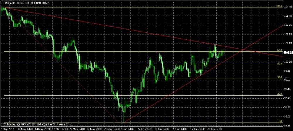 the pair is testing now the resistance level 61.8% , so i think if it can break it , it will continue upward till reach the down trend and make retest , else it will reverse and continue down till reach the bullish trend and there we can buy with small stop lose below this trend ,