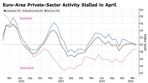 यूरोजोन में व्यापार गतिविधि सूचकांक बढ़ी हुई अनिश्चितता के बीच गिर रहे हैं। अप्रैल में समग्र सूचकांक 50.9 से घटकर 50.1 हो गया, जो संकुचन क्षेत्र के करीब पहुँच गया है।