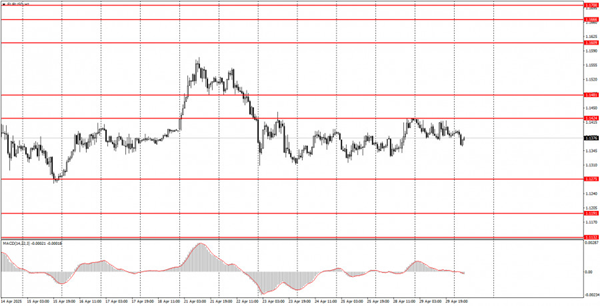 बुधवार के लिए कई महत्वपूर्ण मैक्रोइकॉनोमिक घटनाएँ निर्धारित हैं, लेकिन हमें संदेह है कि इनका करेंसी पेयर की मूवमेंट्स पर कोई महत्वपूर्ण प्रभाव पड़ेगा। बाजार अधिकांश मैक्रोइकॉनोमिक विकासों की अनदेखी करता रहता है। जर्मनी से आने वाली रिपोर्ट्स — जिसमें खुदरा बिक्री, बेरोजगारी, मुद्रास्फीति, और GDP शामिल हैं — महत्वपूर्ण प्रतीत होती हैं, लेकिन ये केवल एक यूरो क्षेत्र के देश से संबंधित हैं, हालांकि वह सबसे बड़ी अर्थव्यवस्था है। यूरो क्षेत्र-व्यापी प्रारंभिक अनुमान के अनुसार Q1 2025 का GDP भी आज जारी किया जाएगा, लेकिन ऐतिहासिक रूप से, बाजार ने GDP डेटा पर शांतिपूर्वक प्रतिक्रिया दी है। अमेरिका में, दोनों GDP और ADP रोजगार रिपोर्ट्स जारी होने वाली हैं। फिर भी, GDP रिपोर्ट को शायद नजरअंदाज किया जाएगा, और ADP को "नॉनफार्म पेरोल्स रिपोर्ट" का "जूनियर संस्करण" माना जाता है, जिसे बाजार अधिक महत्व देता है। इन डेटा पॉइंट्स से कुछ उतार-चढ़ाव संभव है, लेकिन यह आश्चर्यजनक नहीं होगा अगर यूरो दिन के अंत तक अपनी साइडवेज चैनल में फंसा रहे।