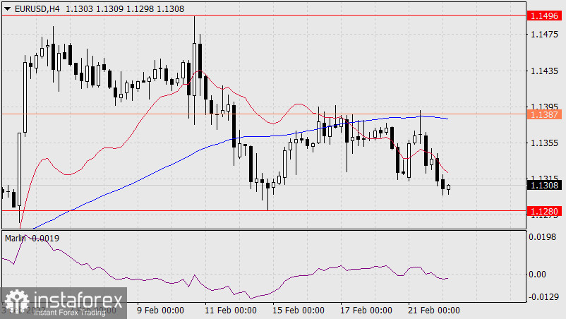 चार घंटे के चार्ट पर, कीमत संकेतक संतुलन रेखा पर समाप्त हो रही है, मार्लिन ऑसीलेटर शून्य रेखा के साथ साइडवेज़ में बढ़ रहा है। यूरो नए भू-राजनीतिक संकेतों की प्रतीक्षा कर रहा है।