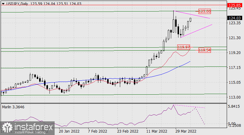 डॉलर (0.49%) की सामान्य मजबूती की पृष्ठभूमि में, usd/jpy जोड़ी कल 82 अंकों की वृद्धि हुई। डॉलर की वृद्धि इतनी आश्वस्त करने वाली थी कि अमेरिकी स्टॉक इंडेक्स s&p 500 में 1.26% की गिरावट भी युग्म की वृद्धि को धीमा नहीं कर सकी। आज सुबह जापानी निक्केई 225 2.05% नीचे है। मामला इस तथ्य के करीब हो सकता है कि usd/jpy दैनिक पैमाने पर एक त्रिभुज बनाएगा। एक अन्य संभावित उलट परिदृश्य मौजूदा स्तरों से मूल्य में वृद्धि या तो 125.00 के पहले लक्ष्य तक या विचलन के गठन के साथ 125.85 पर दूसरे लक्ष्य तक हो सकता है।