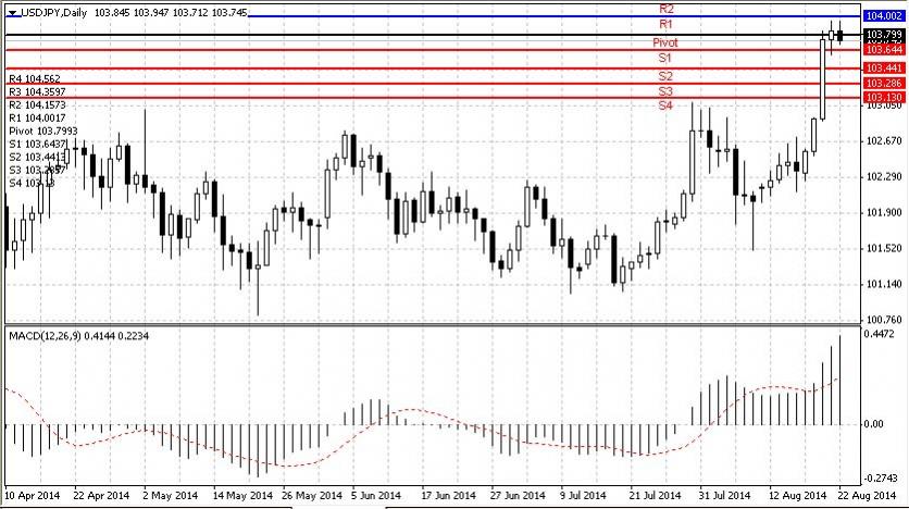 Trading analysis for 22nd August, 2014. In Daily chart USDJPY at this time little bit below from the pivot point. The pair strongly bullish trend, but at this time USDJPY not break the 1st resistance level. If its breaks the 1st resistance level then it goes further upward to the strong resistance level that is 104.562.