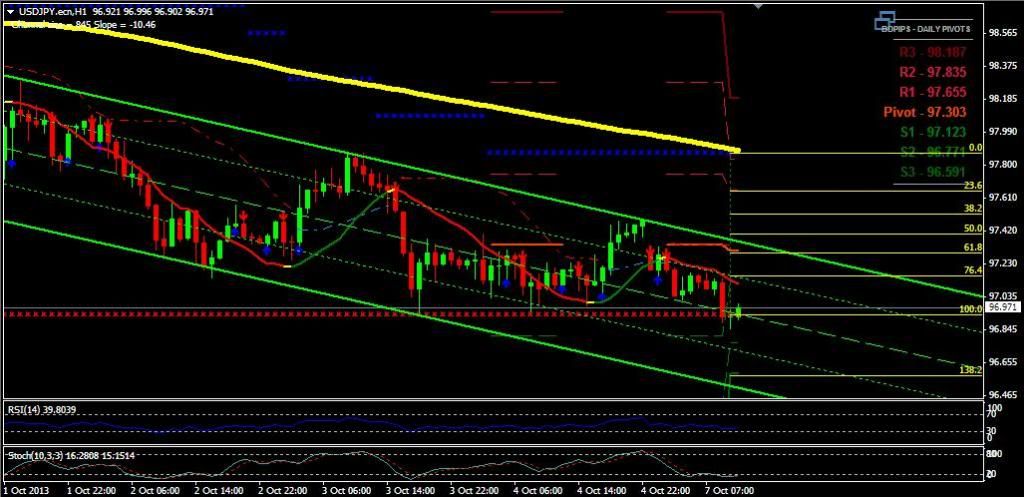USD/JPY pair price already touched daily support 1 level (97.123). Now the price try to move up ward. I think the price may touch daily pivot point (97.303).