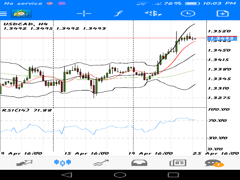 bearish trend seems to be taking place on the USDCAD pair and that’s according to the green color shown by the Bollinger Bands indicator determining by that the main market direction. A sell signal is indicated from the Simple Moving Average indicator and that is by giving us buy signal. This pair can continue bearish trend, now current price at 1.3472 and strong resistent in hourly time frame at level 1.3494 there is possible chance price will move to up side. then next low price is 1.3421
