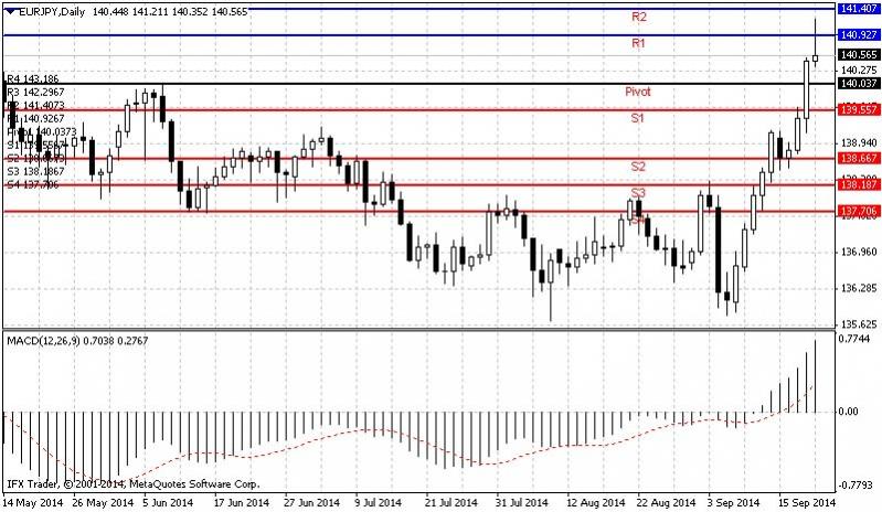 Trading analysis for Daily forecast of EURJPY 22 September, 2014. In Daily chart EURJPY shows bearish trend. At present EURJPY below the pivot point and going towards the 1st support level. If 1st support level breaks then next strong support level is 136.790.