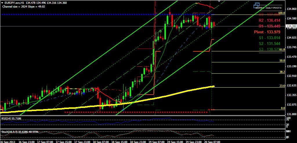 EUR/JPY pair price already touched Fibonacci 100.0 level. Now the price try to move down ward. I think the price may touch daily pivot point (133.979).