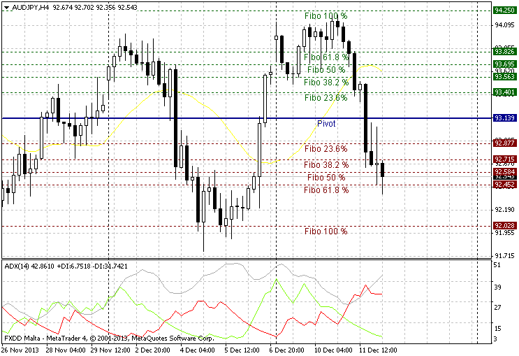 Trading analysis for 12th Dec, 2013. AUDJPY in DAILY chart shows bearish trend. The price below the pivot point and try to break 1st support level i.e., 92.140. If the 1st support level breaks then next strong support level is 89.696.