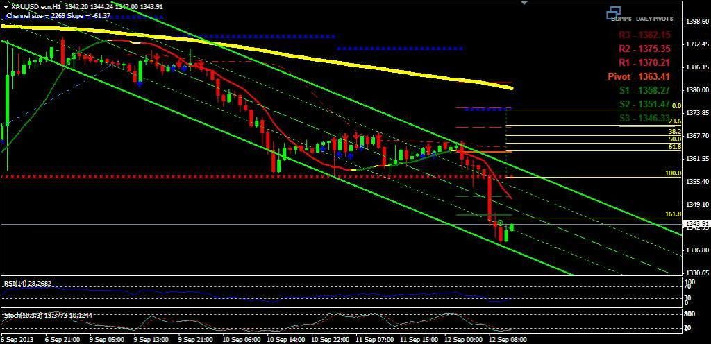 Gold today break 1355 support level, now daily up trend line has been broken and pair is strong bearish now only closing above 1337 will disturb the bearish trend.