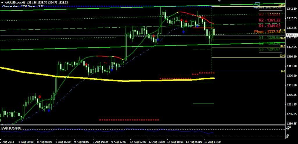 As you see in my following attached chart, the price of the gold traded between a high of 1334 and a low of 1315, closed at 1338. Today the metal trades below the resistance line of 1344.