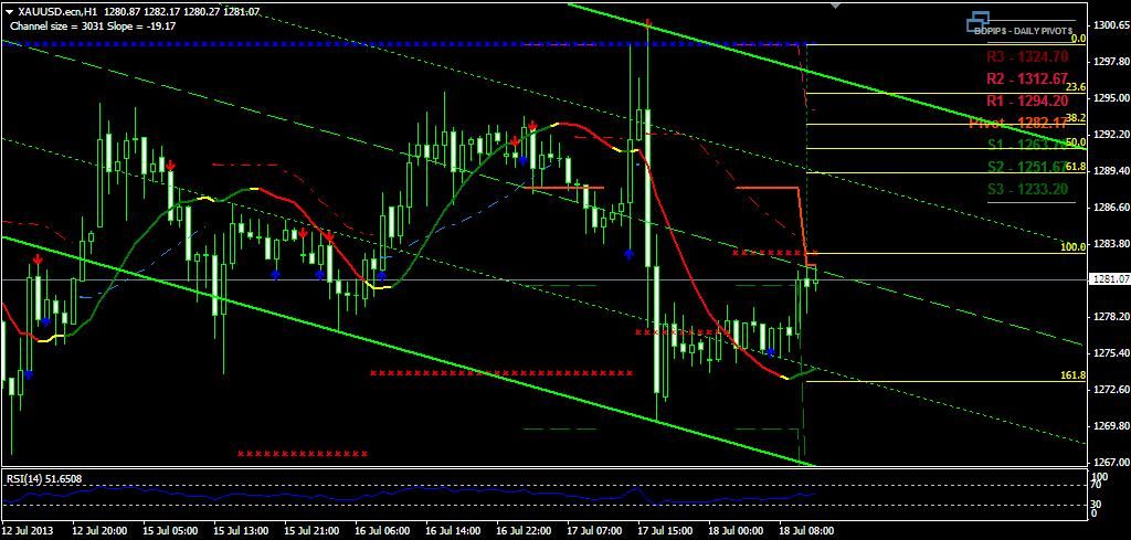 GOLD Trading Signal - 18/7/2013 - 10:00 GMT+3 60min CHART Downwards Weak