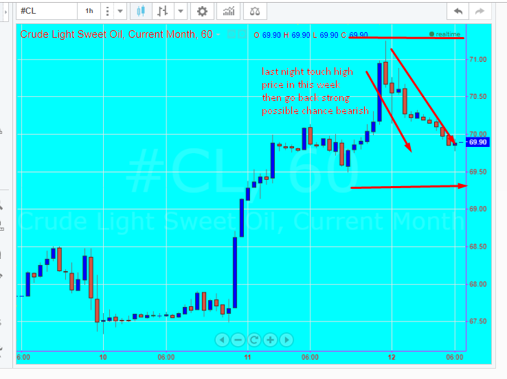 crude oil last night touch the very high rate and going strong back and now current price is 69.89 and today high rate is 70.27 and low rate is 69.78 possible chance is down but if again break out the support then go up and resistance level is 70.89 and supporting level is 69.35 if break then go target 67 to 65
