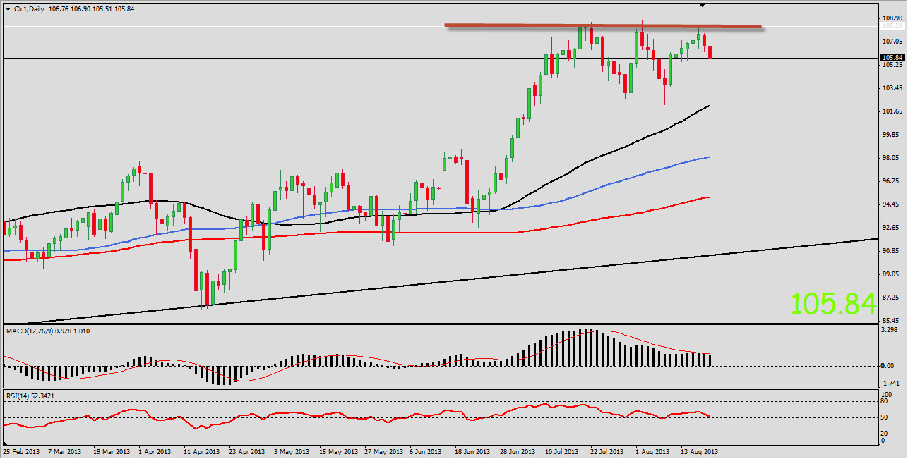 As you see in my following chart, the prie of the crude oil traded between a high of 107.71 and a low of 106.29, closed at 106.78. Today the commodity trades below the resistance line of 108.30.
