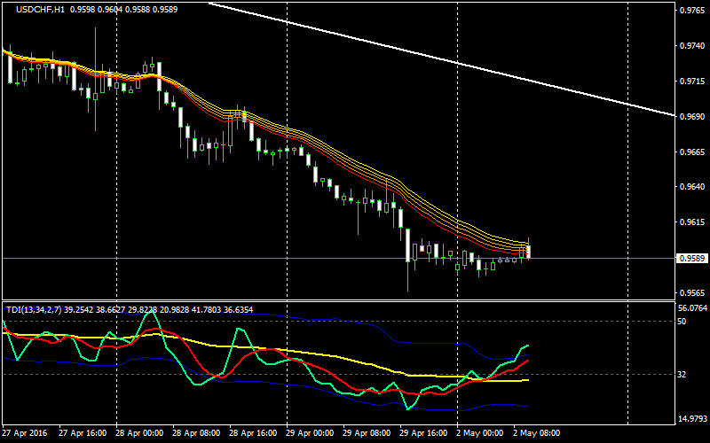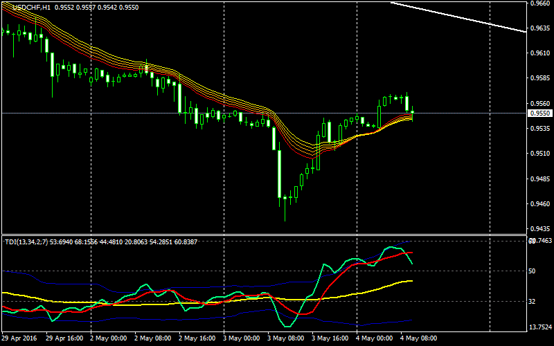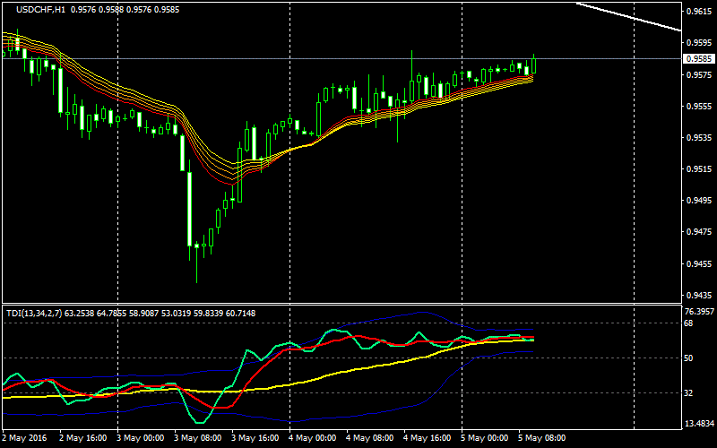 After the today start the cost goes above the Trendline marker and leads the deal to a upward trend and after that the worth seems to start rising setting the scores of the resistance scale at 0.9575 as the next mark move. On the other way the bullish direction still still not still assured by the set of drift indicators as they don't have all the bullish signal so we can say the indicators is it may be week at the moment. By the way the TDI indicator holds near the middle brink and have a sell indicative which may be a good warning for the reasoning of entering with the bullish way till it changed the bearish point.
