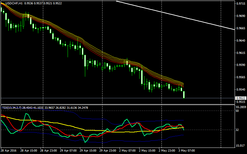 After the Today start the price heads below the Trendline indicator after the opening today and leads the market to a downward guidance and then the price seems to opportunity falling setting the scores of the support levels at 0.9515 as the next mark move. On the other way the bearish pattern still still not assured by the set of way indicators as they don't have all a bearish sign we can say the move is obviously week at the moment. from the way that TDI pointer keeps close to the middle edge and have a sell signal which could be a excellent confirmation for the thinking of entering with the bearish direction till it adjust the bullish signal.